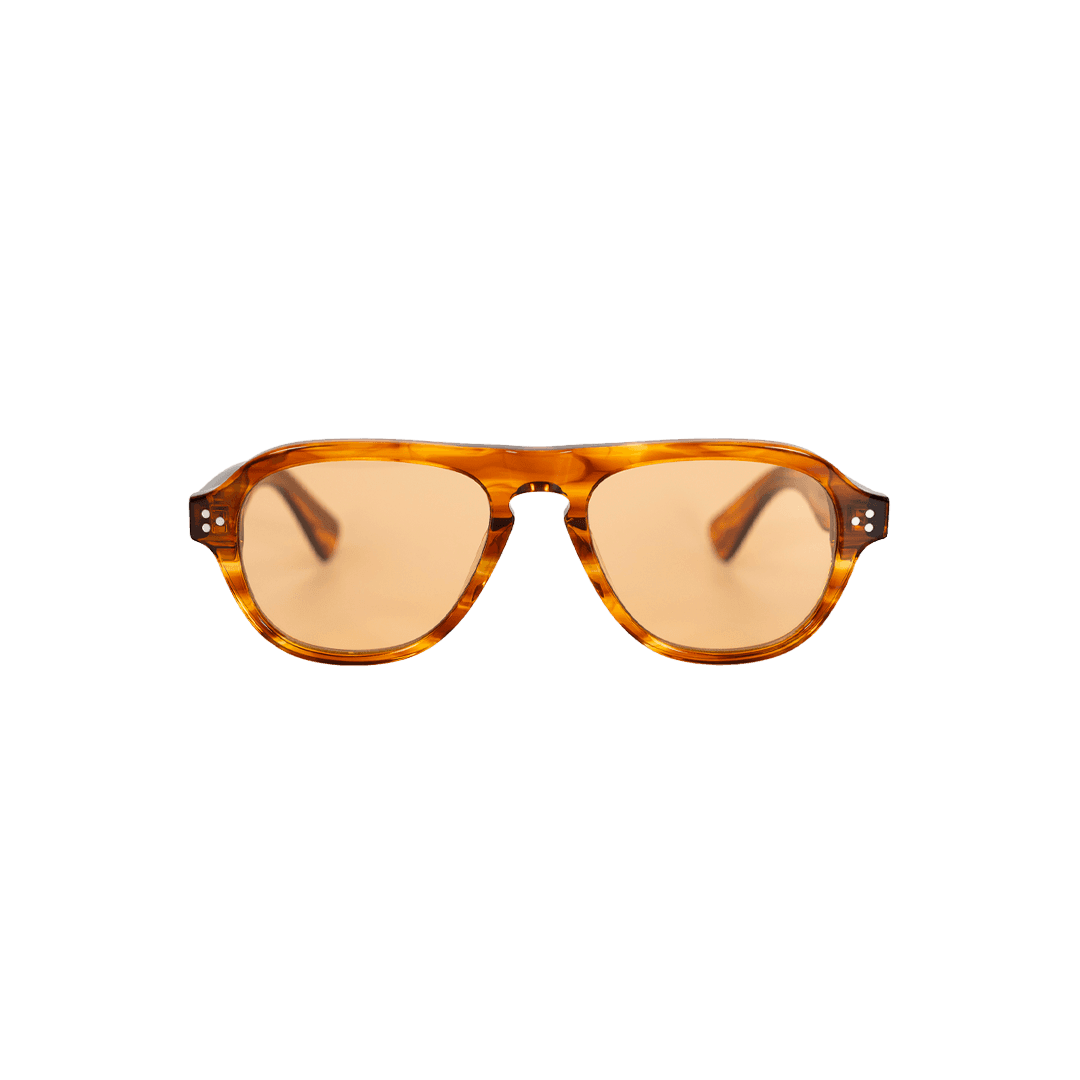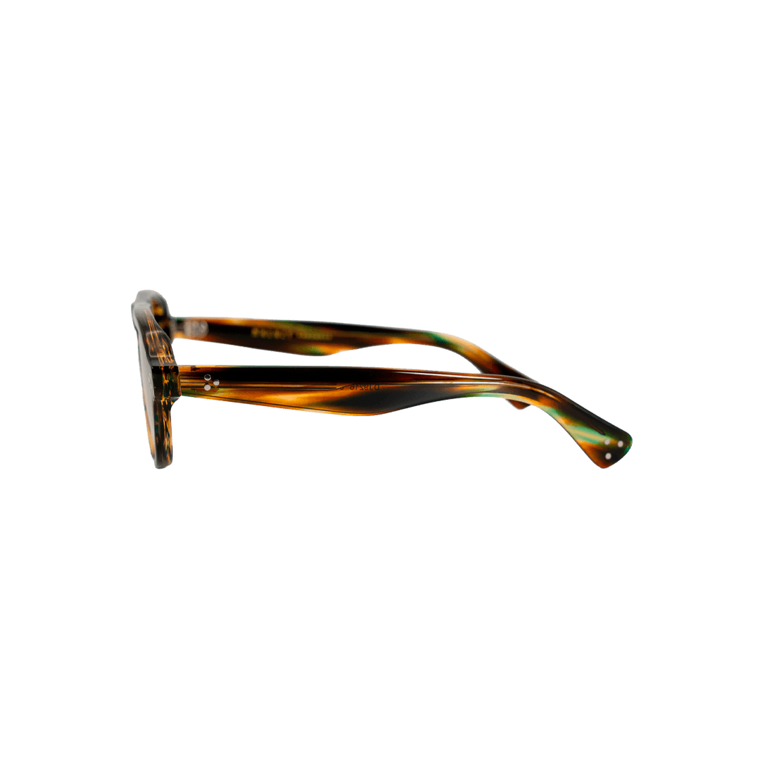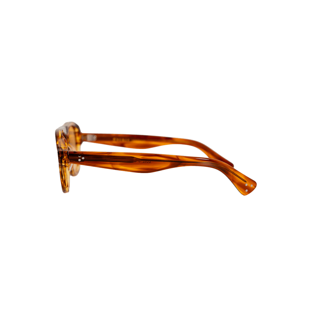 Armação aviadora de lentes ovais em acetato de corte generoso e espessura pronunciada, com dupla barra superior que acompanha a curvatura das lentes em movimento contínuo. A ponte pequena e elevada e as hastes largas com ponta bem curva completam uma silhueta que é puro anos 70 sem precisar de contexto. Para quem usa óculos como extensão da própria personalidade e não como acessório secundário. Combina com linho, couro natural, estampas de época e qualquer look que tem calor e intenção. Volumoso, orgânico e com uma energia que não se copia.