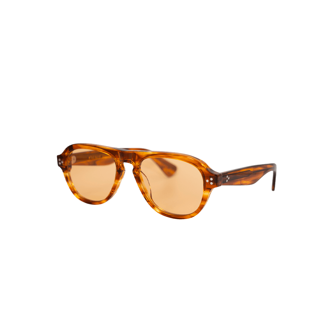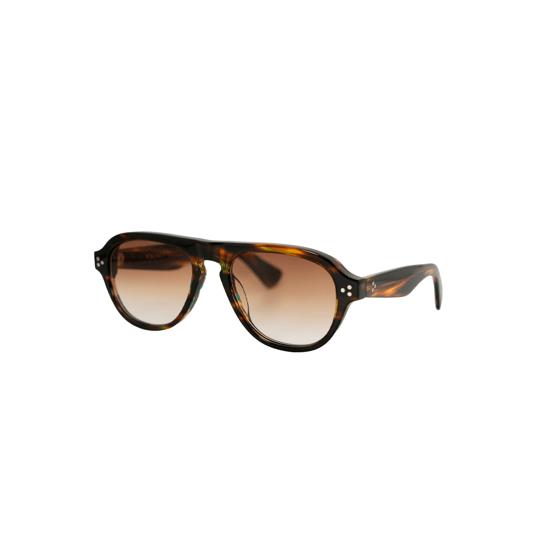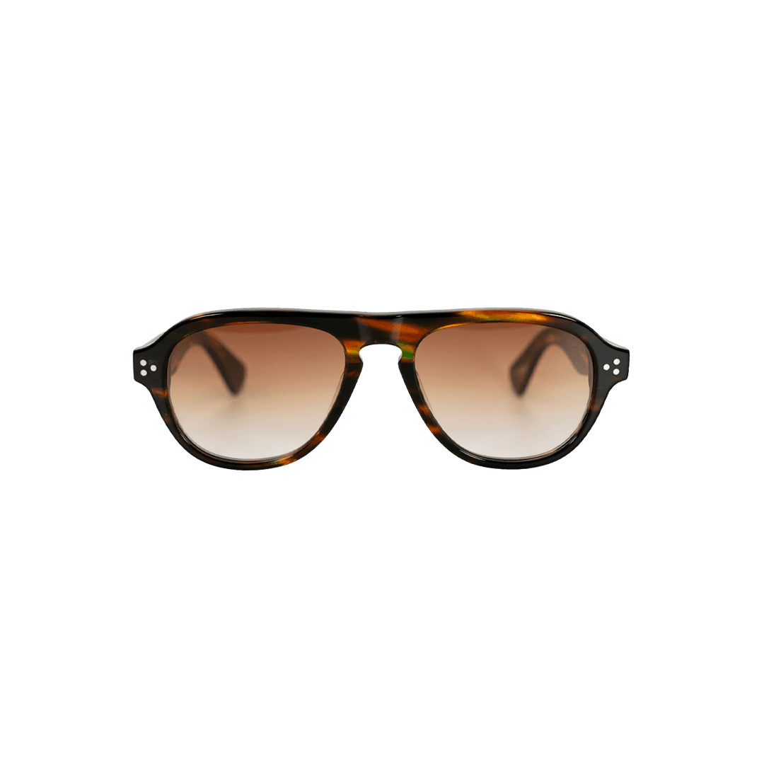 Armação aviadora de lentes ovais em acetato de corte generoso e espessura pronunciada, com dupla barra superior que acompanha a curvatura das lentes em movimento contínuo. A ponte pequena e elevada e as hastes largas com ponta bem curva completam uma silhueta que é puro anos 70 sem precisar de contexto. Para quem usa óculos como extensão da própria personalidade e não como acessório secundário. Combina com linho, couro natural, estampas de época e qualquer look que tem calor e intenção. Volumoso, orgânico e com uma energia que não se copia.